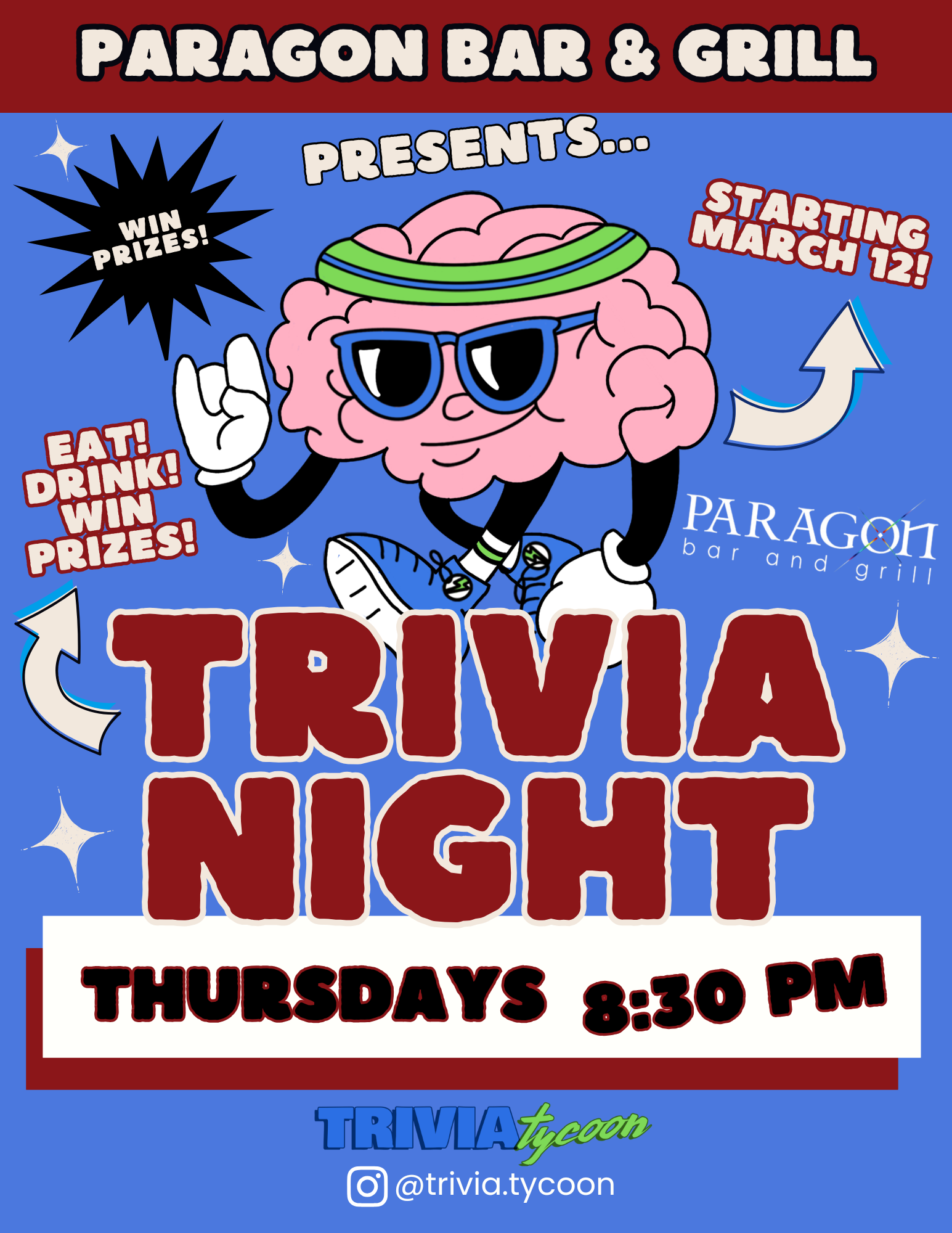 We have changed our weekly Thursday Night Trivia to Trivia Tycoon. It's a whole new game and we are really excited to have them here starting this week. Come and check them out, starting in April we will be having a 10 week contest with a grand prize for the winner. See you at Paragon to find out what the grand prize is.