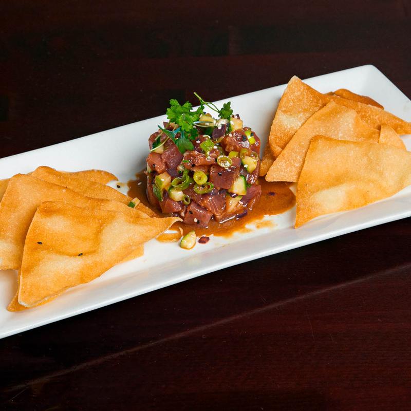 Tagarashi crusted ahi tuna served rare with mixed greens, cucumber, avocado, wasabi aioli, and a sweet soy drizzle.